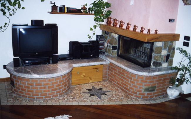 Camino moderno camino nel contesto moderno usando materiale rustico che si va ad abbinare al materiale presente nella stanza.