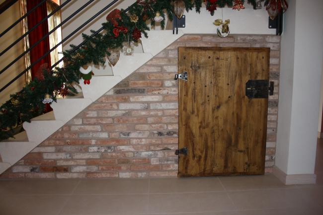 Altro finitura particolare di un sotto scala con: mattoni vecchi a facciavista, porta vecchia con cerniere e serrature di recupero, poi all'interno un carrello di cui si può posare di tutto