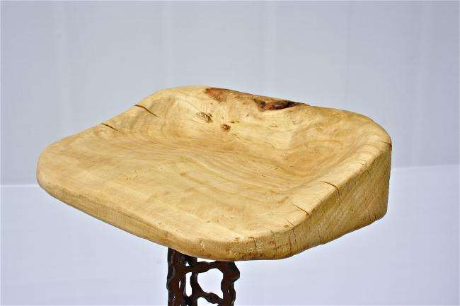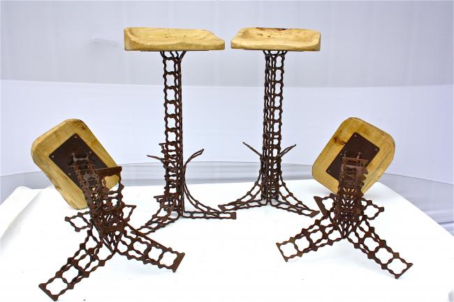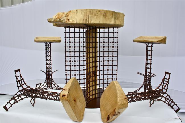Tavolino da aperitivi, eseguito recuperando un tronco di legno poi lavorato e sagomato in merito compreso i seggiolini, il supporto in ferro è sempre fatto con recupero di ritagli dalla lavorazione al laser.